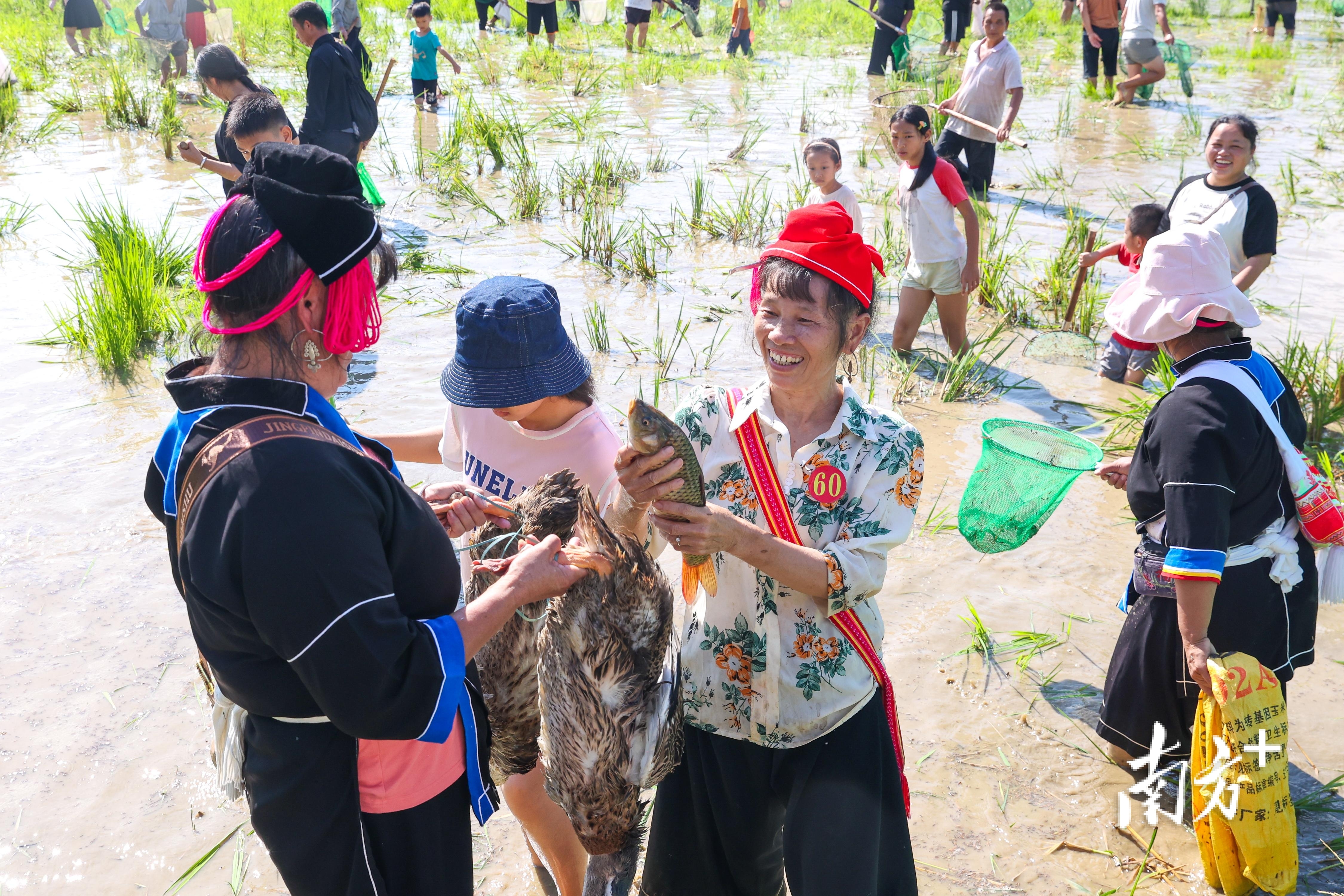 作为本届文化季的核心体验环节,“全民渔乐”活动生动展现出连南瑶族“稻鱼共生”的千年生态农业智慧。勤劳聪明的排瑶人民为解决粮食增收的问题,在稻田中放养鱼苗,鱼苗在吃稻花、稻虫和杂草长大的同时,也为禾苗除草除害。如今在连南,稻田鱼已不仅仅是一个传统的耕作方式,而是形成了一个生态产业。