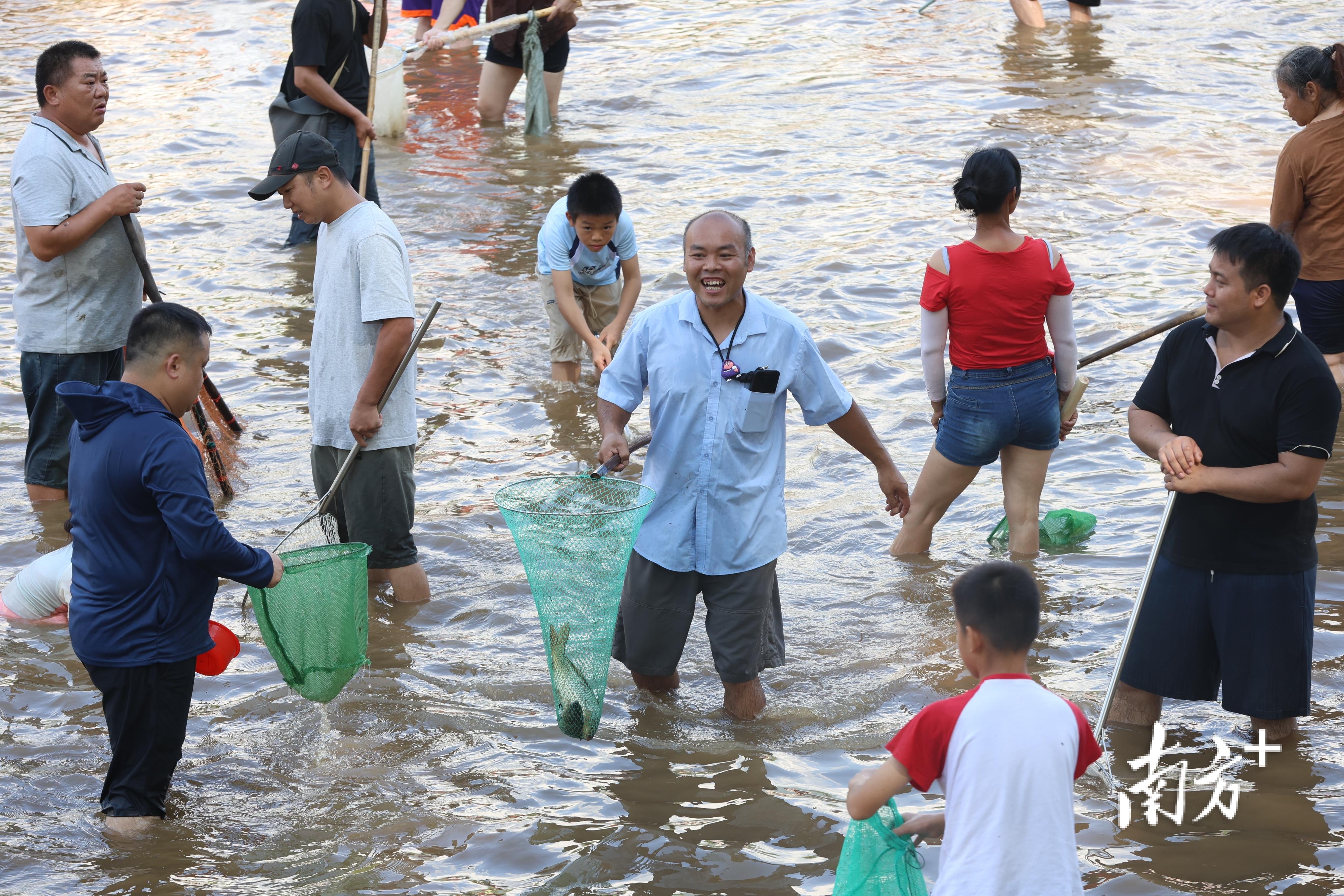 活动当天,连南县城三江河两岸,排满了准备下河“渔乐”的游客与本地群众。随着主持人的一声“开始”,平日宁静的三江河畔,转眼化作一片欢乐的海洋。来自全国各地的游客、当地村民和亲子家庭纷纷卷起裤腿,手持各式渔具踏入清凉河水,展开一场趣味横生的抓鱼追逐战。