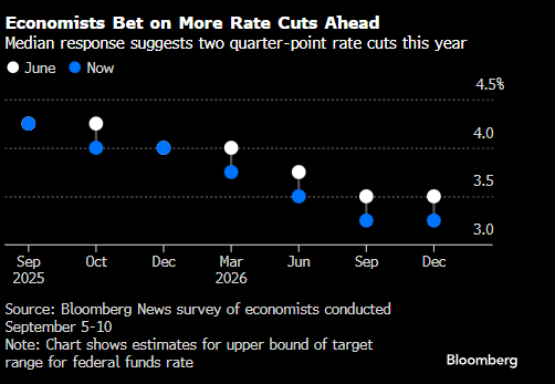 受访者中值预期显示年底前将有两次降息,但相当一部分人(超过40%)预期将有三次降息。在预测两次降息的经济学家中,关于第二次降息将在10月还是12月实施的看法几乎平分秋色。