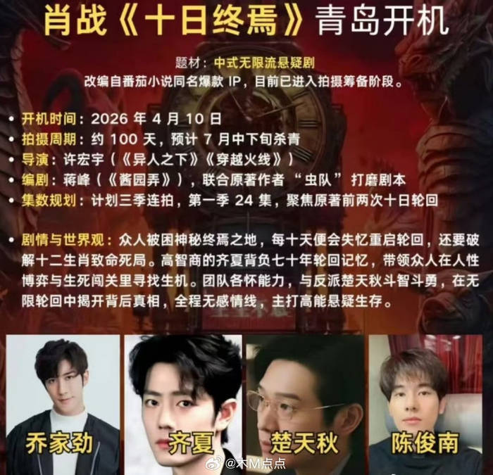 从24万预约量的未播先火,到原著作者杀虫队队员直播时160万人在线催更,《十日终焉》的每一步都自带流量。但悬疑剧的核心始终是剧本,蒋峰编剧如何平衡原著的暗黑设定与审核尺度?“十二生肖游戏”能否拍出原著的窒息感?这些疑问,或许要等今年7月杀青后才能初见分晓。不过可以肯定的是,当肖战的“疯批眼”遇上魏大勋的“反派笑”,这部剧的名场面预定已经开始了。